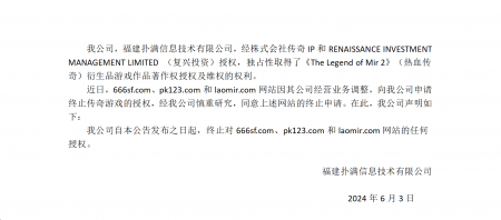 福建撲滿信息技術(shù)有限公司注冊地位于福建省福州市,是國內(nèi)《熱血傳奇》客戶端游戲獨(dú)占性版權(quán)人。對《熱血傳奇》客戶端游戲擁有全部版權(quán),并有權(quán)基于版權(quán)權(quán)利進(jìn)行該游戲維權(quán)。株式會社傳奇IP (以下簡稱傳奇IP )對《The Legend of Mir 2》(中文名為“熱血傳奇"、或“傳奇”、“傳奇2”、“MIR II”)游戲(以下稱為 “授權(quán)作品”) 共同享有充分、完整且有效的著作權(quán)。經(jīng)傳奇IP授權(quán) , RENAISSANCE INVESTMENT MANAGEMENT LIMITED (以下簡稱 RENAISSANCE Ltd.)有權(quán)在中國大陸地區(qū)獨(dú)占性地對授權(quán)作品的網(wǎng)絡(luò)客戶端游戲進(jìn)行開發(fā)、 發(fā)行、管理、宣傳、推廣和運(yùn)營,針對授權(quán)作品的侵權(quán)游戲及侵權(quán)方,RENAISSANCE Ltd.有權(quán)采取必要的措施,并有權(quán)將前述權(quán)利分授權(quán)給第三人。福建撲滿信息技術(shù)有限公司經(jīng)RENAISSANCE Ltd.授權(quán),獲得上述權(quán)利,有權(quán)在中國大陸地區(qū)獨(dú)占性地對授權(quán)作品的網(wǎng)絡(luò)客戶端游戲進(jìn)行開發(fā)、發(fā)行、管理、宣傳、推廣和運(yùn)營,并有權(quán)對侵權(quán)行為/主體采取維權(quán)措施。